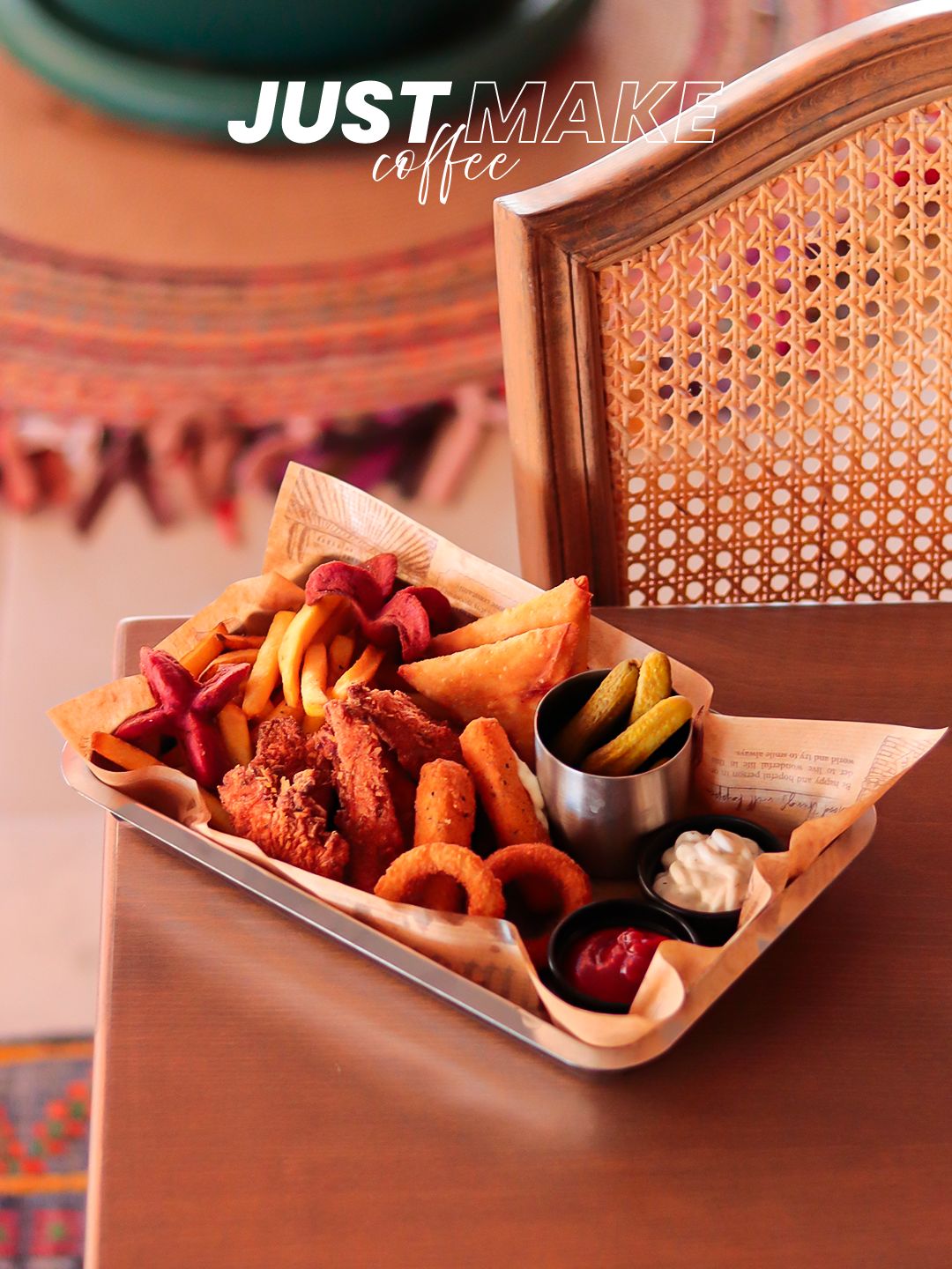 Çıtır patates, 2 adet dana sosis, 2 adet börek, 6 Çıtır tavuk, 2 soğan halkası, 2 peynir çubuğu, ranc sos, sweet chili sos, salatalık turşusu.