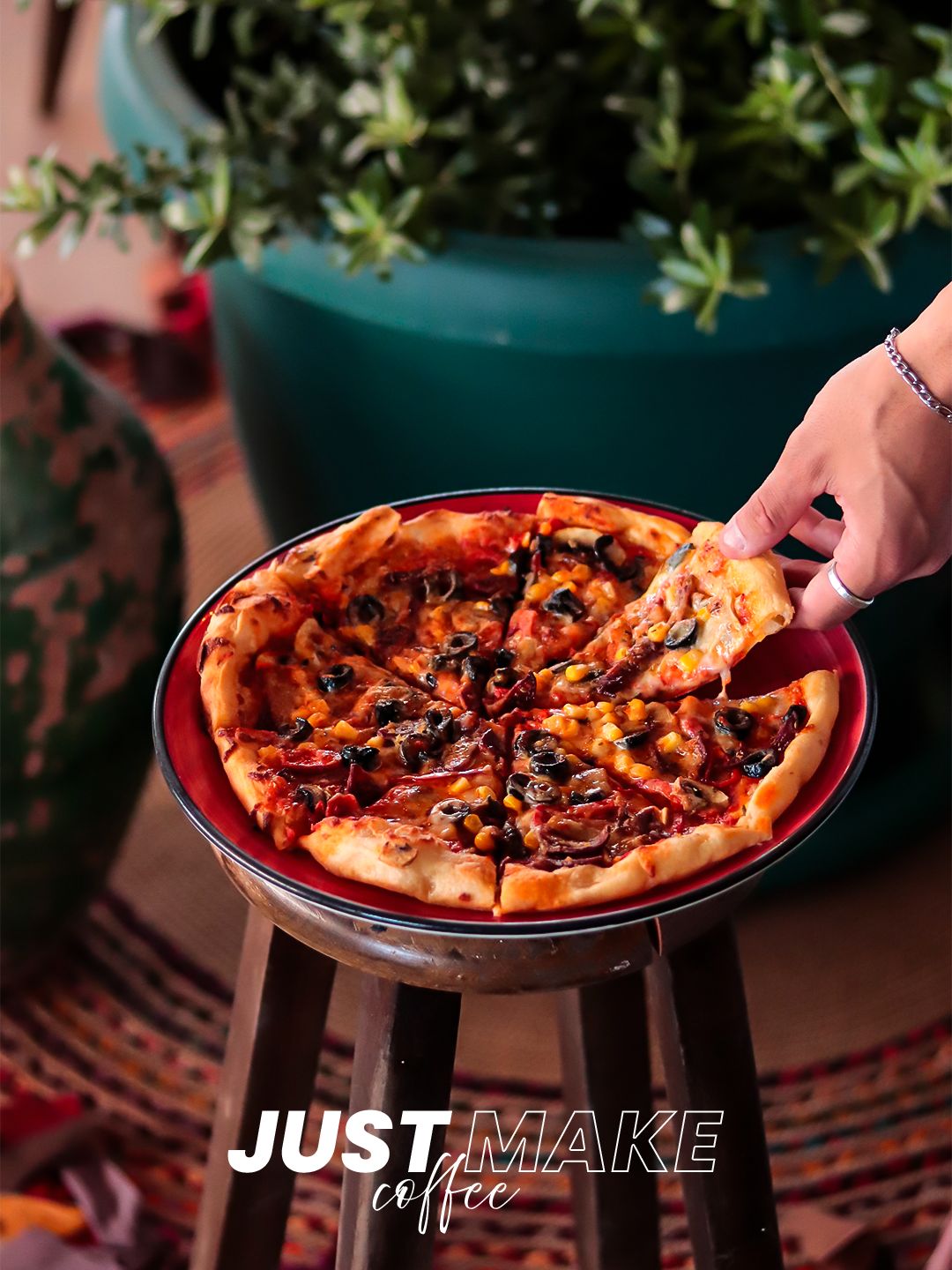 Special hamur üzerine özel sos eşliğinde sucuk, sosis, biber, mısır, mantar.