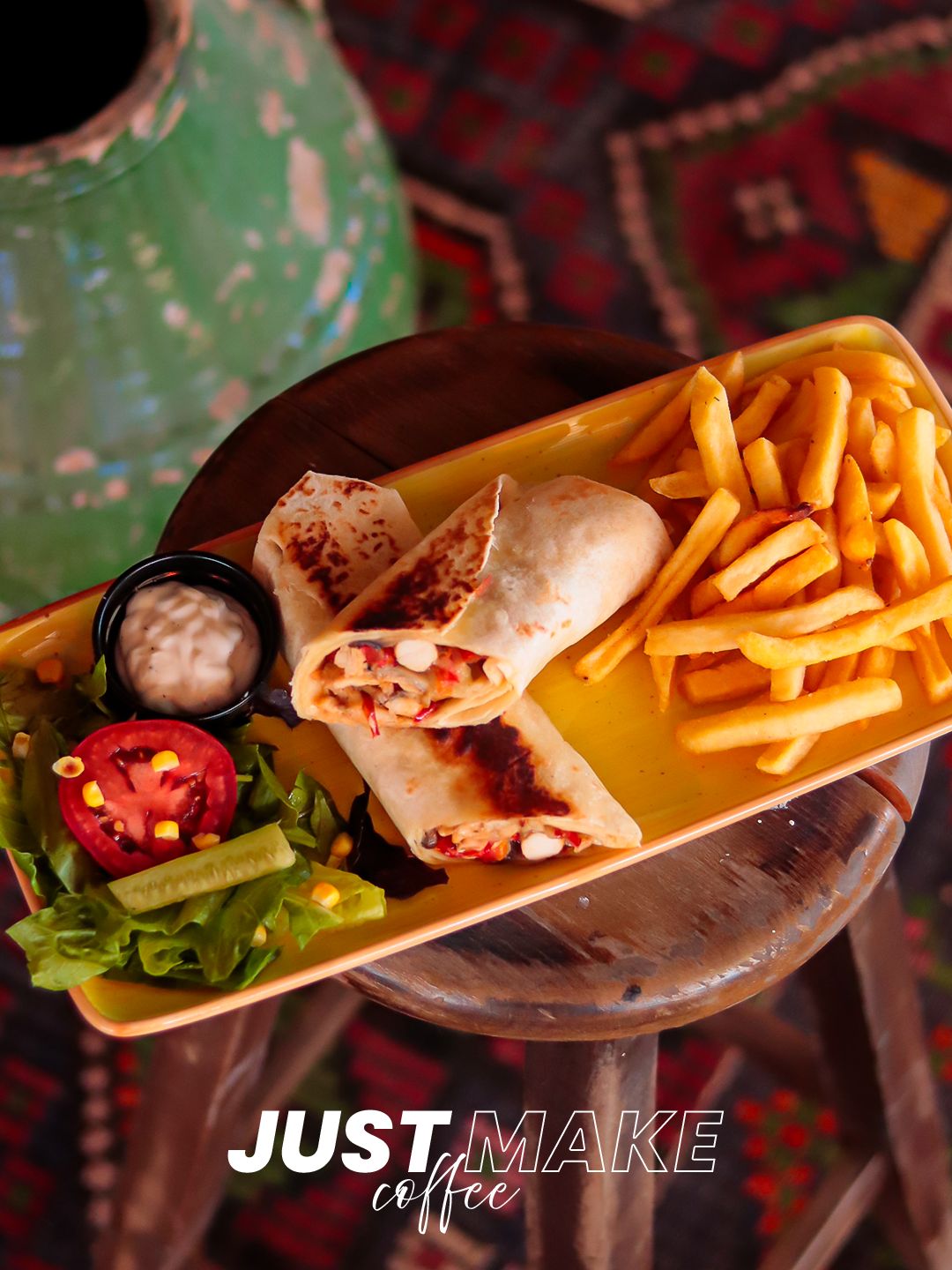 Özel baharatlar ile harmanlanmış köfte parçaları kabya biber mantar krema mozarella peyniri yanında çıtır patates mascolin ve özel sos.