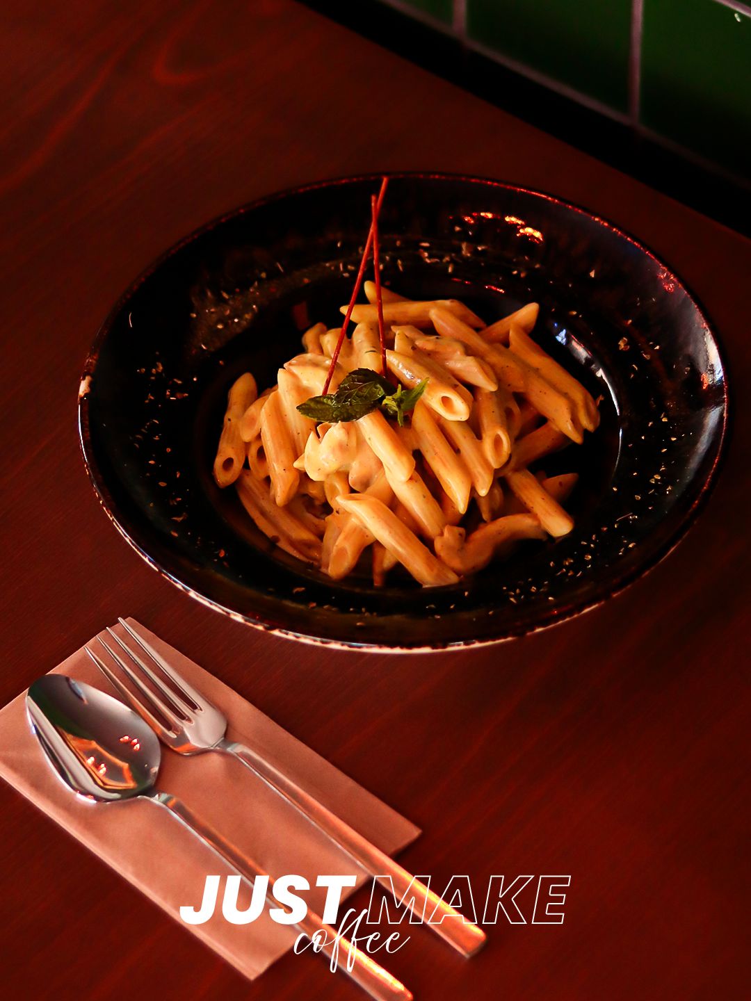 Penne makarna özel baharatlar ile marine edilmiş tavuk parçaları, mantar kekik, kremalı köri sos.