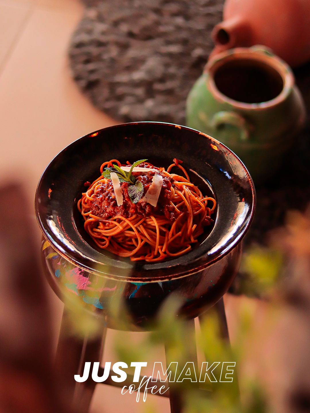 Özel olarak hazırlanmış kıymalı bolonez sos üzerine parmesan peyniri eşliğinde.