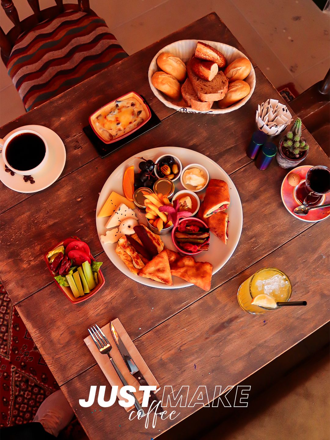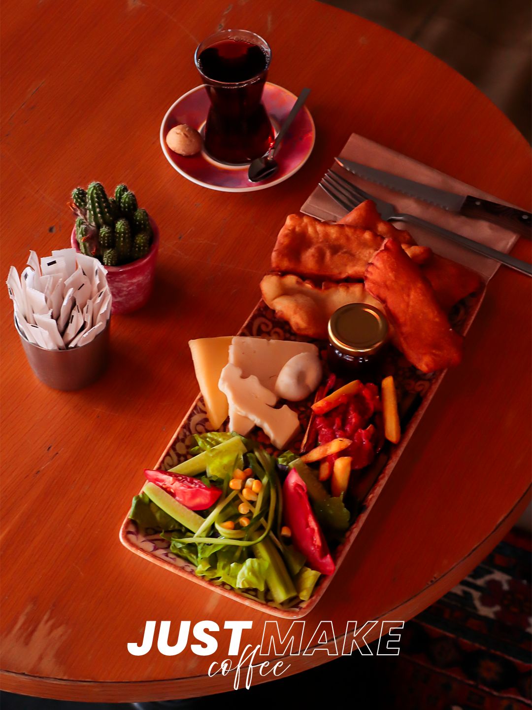4 çeşit peynir (Ezine peyniri, Malatya peyniri, Yüzük peyniri(salamura peynir), Kaşar peyniri). Söğüs Tabağı( salatalık domates yeşillik ızgara yeşil zeytin. Siyah zeytin) Meyve. 1 çeşit reçel, bal, kaymak, tereyağı, nutella. Pişi, patates kızartması, sosis, börek, paçanga böreği, fırınlanmış kremalı mantarlı mozerella. Omlet, sucuk, kızarmış hellim peyniri, soslu karışık kızartma (biber, kabak, patlıcan, domates). Simit, ekmek. Sınırsız çay, Filtre kahve(1 adet), Limonata (1 adet).