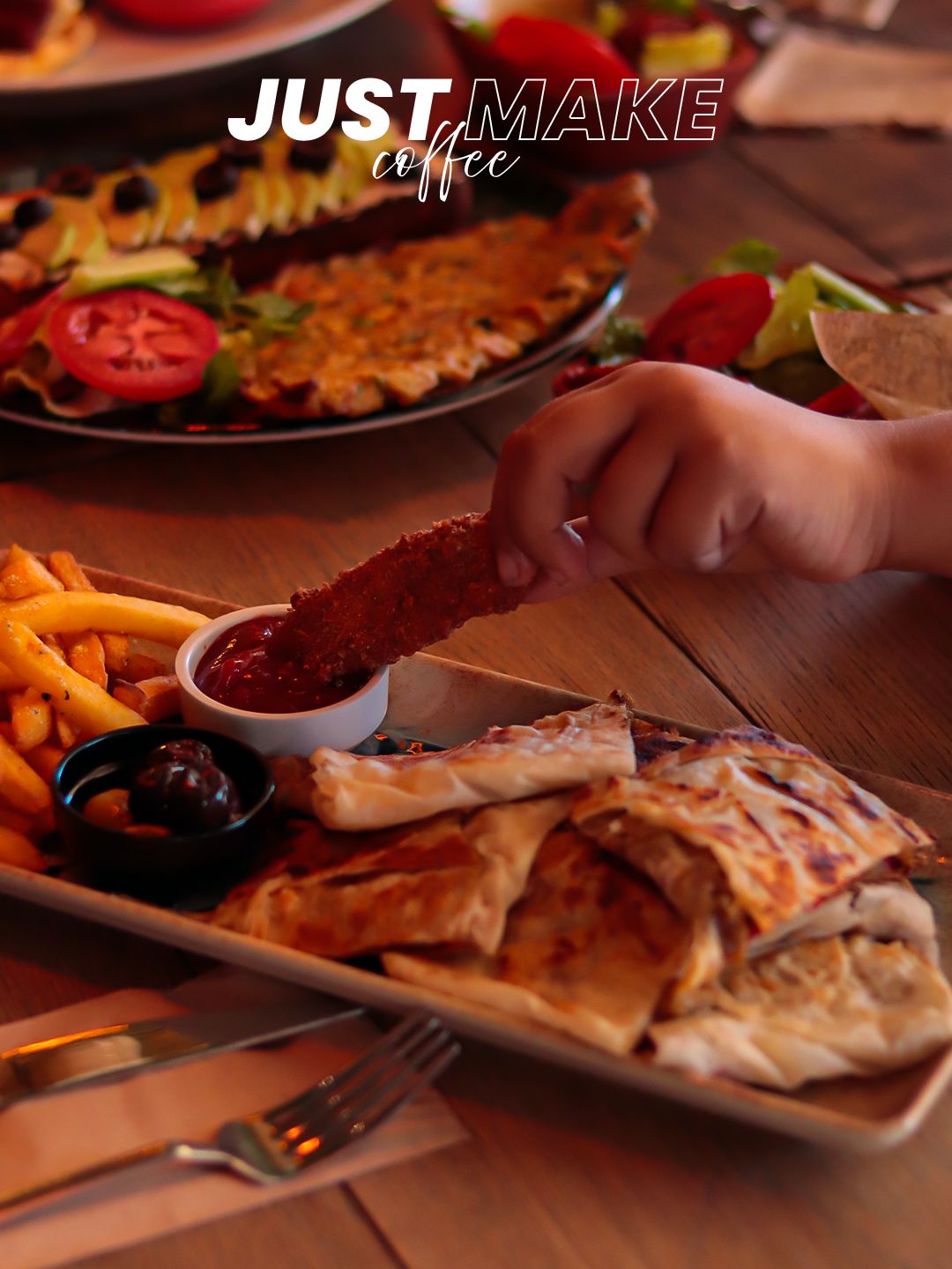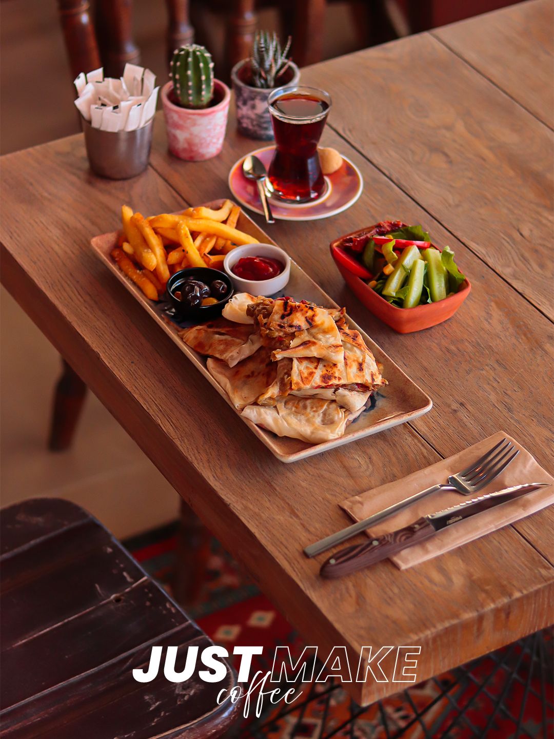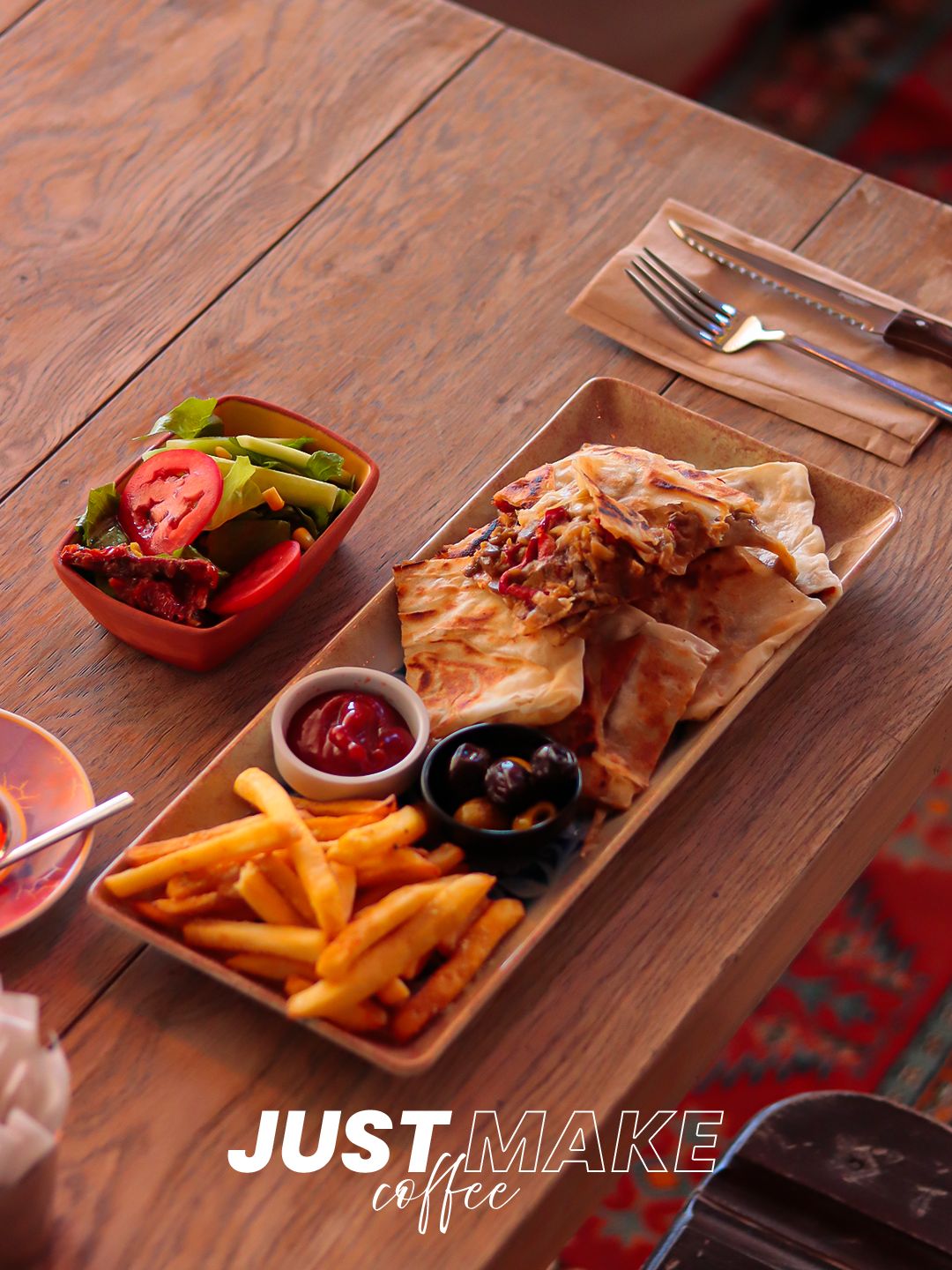 Söğüs tabağı(salatalık domates yeşillik ızgara yeşil zeytin ve siyah zeytin) patates kızartması ile servis edilir.