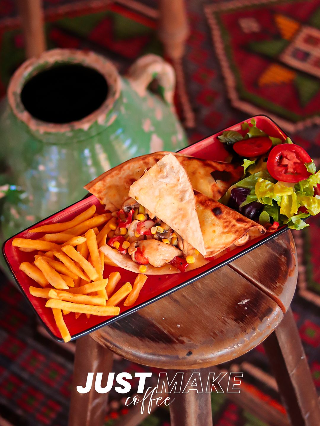 Julyen Biftek, soğan, paprika(kabya), mantar, mısır, kornişon, tortilla, mozarella, Çıtır patates ve mascolin eşliğinde